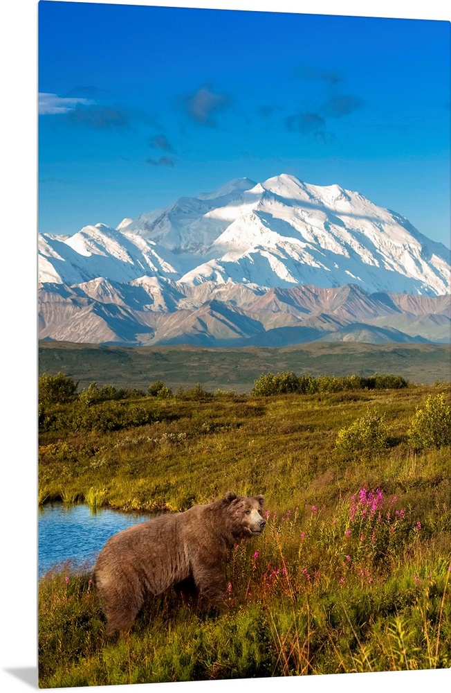<p>Brown bear (ursus arctos) walking in a grass meadow with Mount McKinley in the distance, Denali National Park and Preserve, Alaska, United States of America.</p>