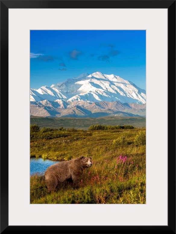 <p>Brown bear (ursus arctos) walking in a grass meadow with Mount McKinley in the distance, Denali National Park and Preserve, Alaska, United States of America.</p>