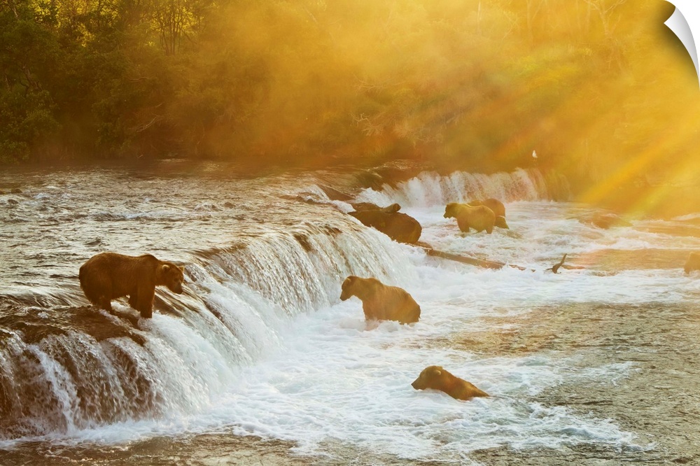 <p>Brown bears (Ursus arctos) gathered at Brooks Falls to fish for salmon, Brooks River, Katmai National Park, Alaska.</p>