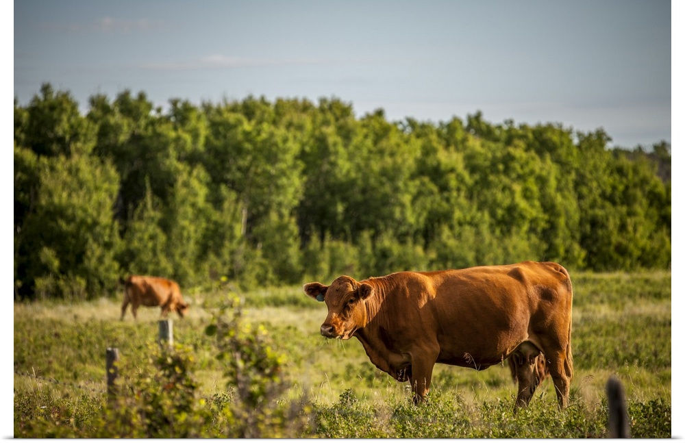 <p>Brown Cows In A Pasture With A Forest On The Edge; Saskatchewan, Canada</p>