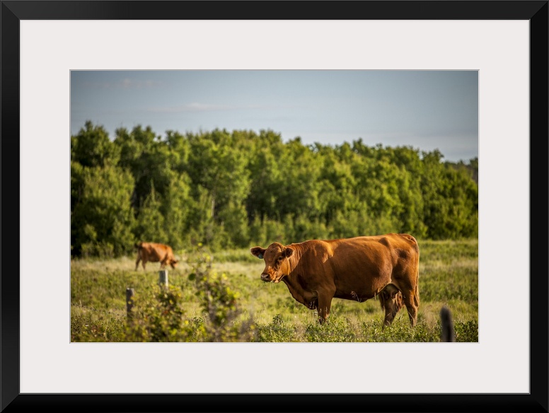 <p>Brown Cows In A Pasture With A Forest On The Edge; Saskatchewan, Canada</p>