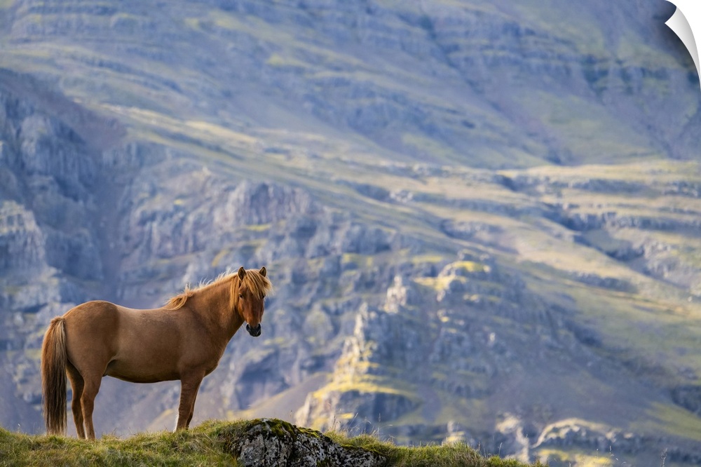 <p>Brown Icelandic horse standing in a grass field with a mountain in the background; Iceland</p>
