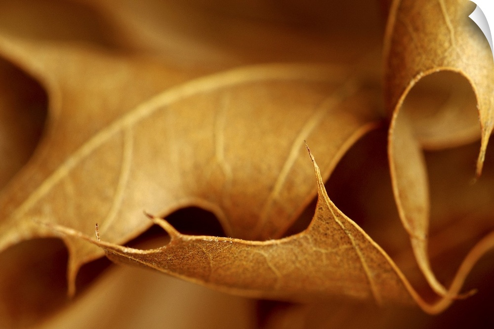 <p>This is an extremely close up nature photograph of autumn leaves piled together.</p>