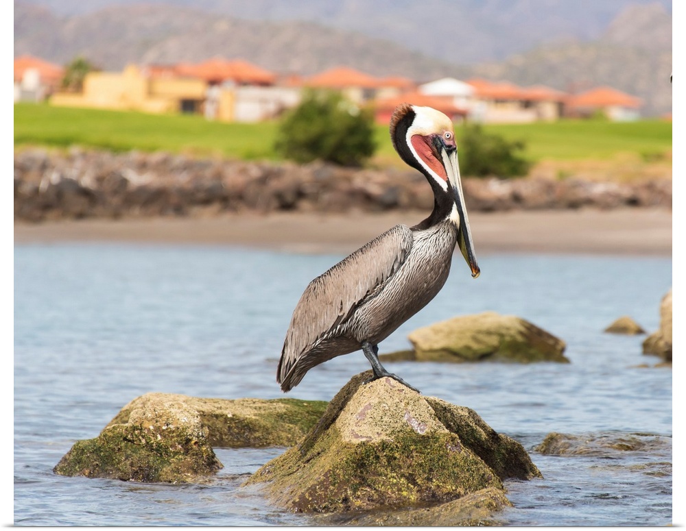 <p>Mexico, Baja California Sur, Sea of Cortez, Loreto Bay. Brown Pelican breeding plumage perches on rock.</p>