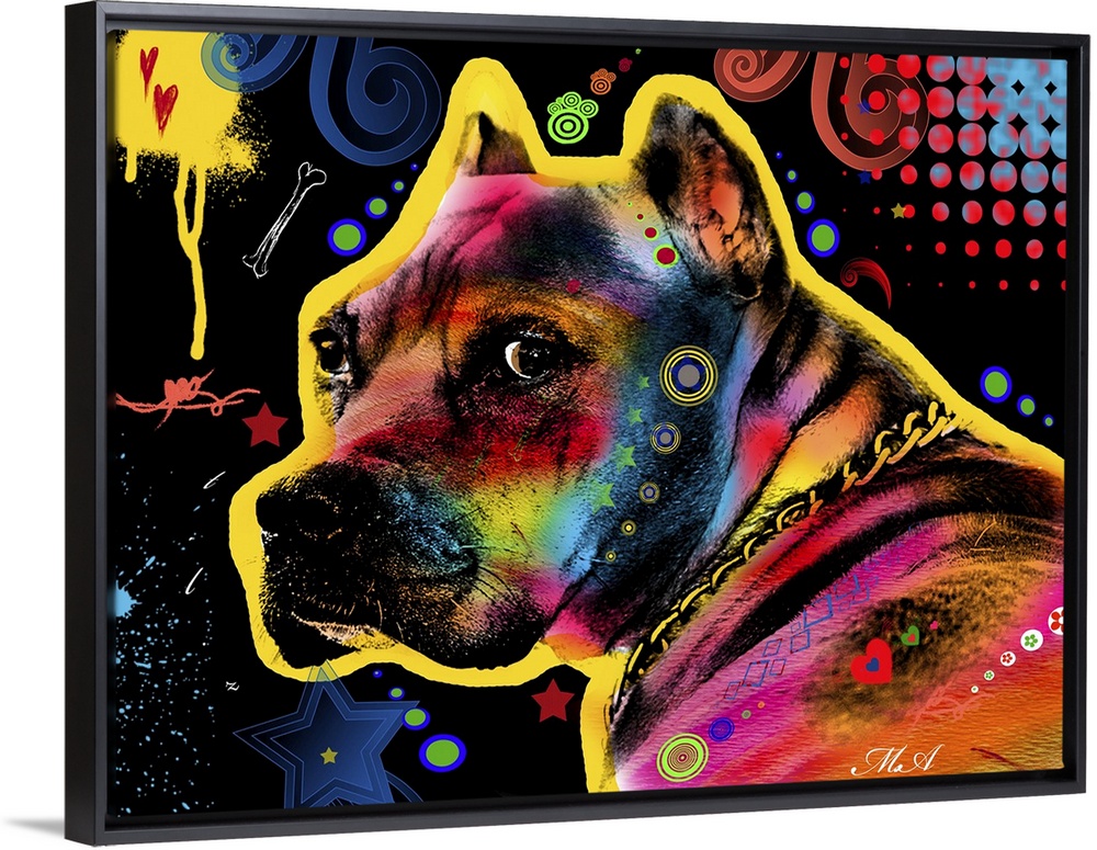 <p>Contemporary artwork of an American Pit Bull colored in an array of bright and vibrant colors.</p>