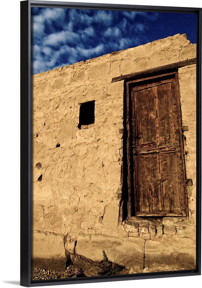 <p>Brown wooden door with blue sky and clouds, Karnak, Egypt</p>