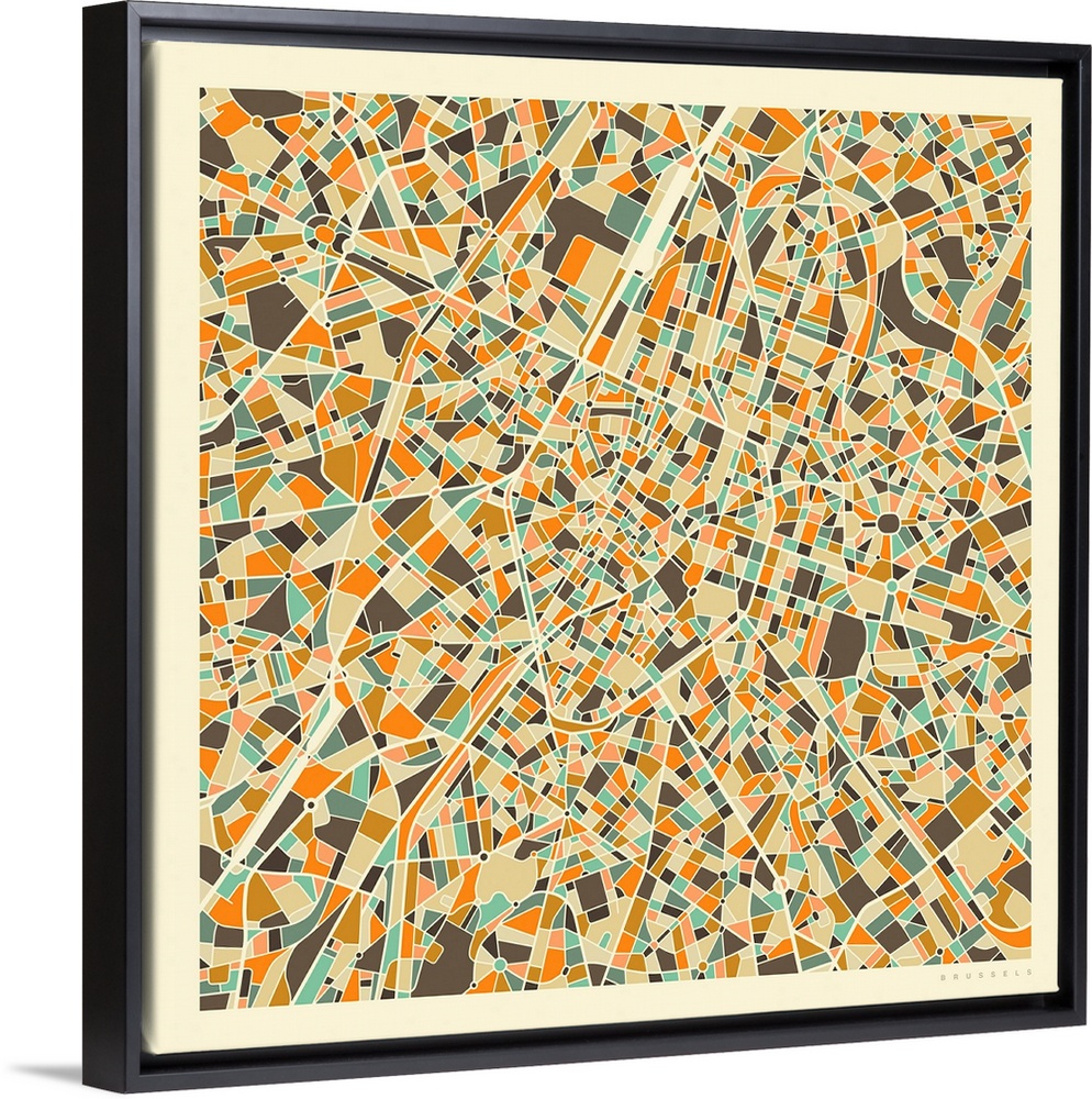 <p>Colorfully illustrated aerial street map of Brussels, Belgium on a square background.</p>