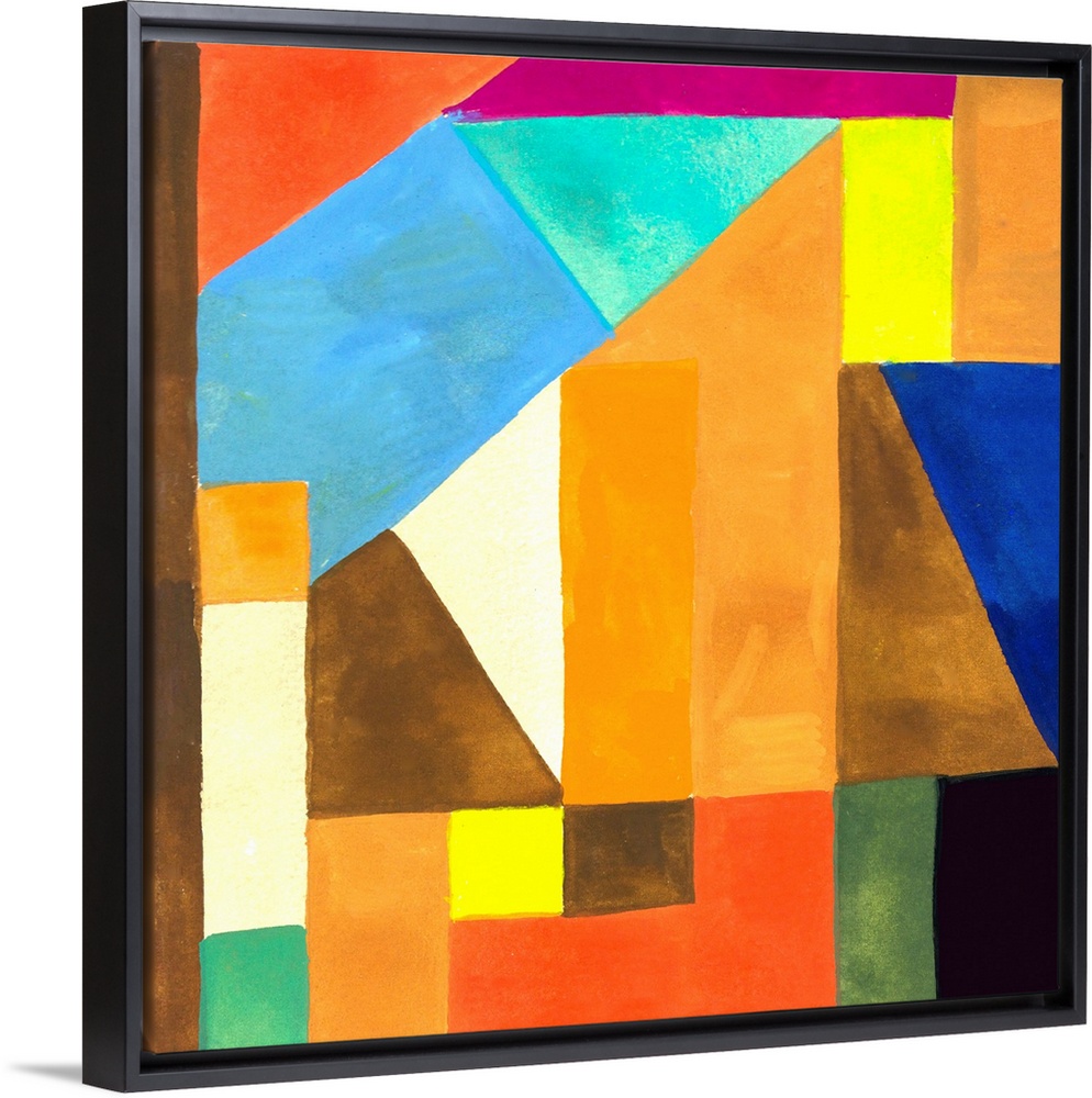 <p>Abstract painting of a variety of angular shapes in bright colors constructed together.</p>
