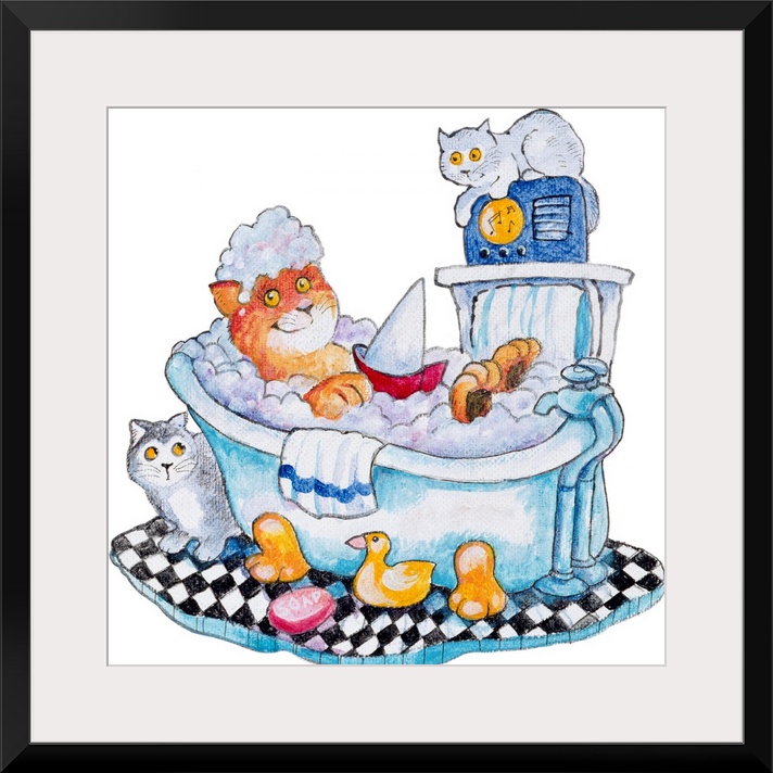 <p>Cat sitting in a bubble bath with two smaller cats and a rubber ducky. bathtub.</p>