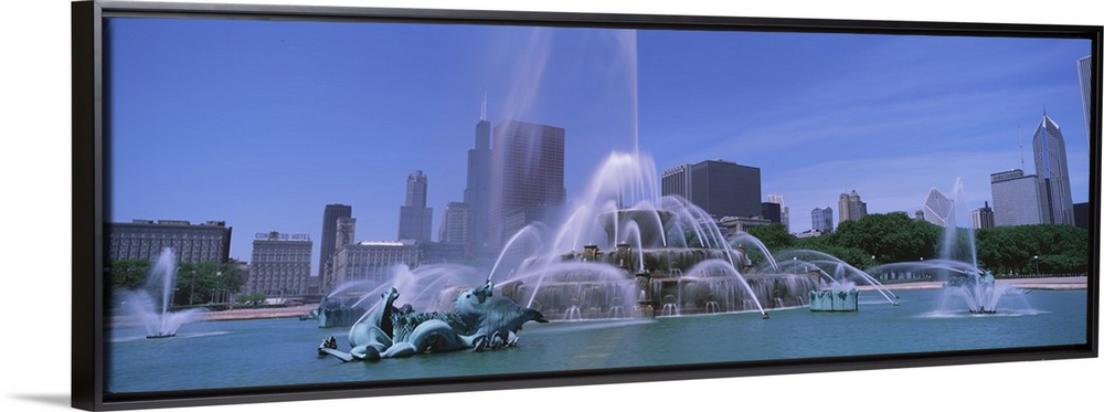 <p>Landscape, close up photograph of Buckingham Fountain during the day, the skyscrapers of Chicago in the background, beneath a blue sky.</p>