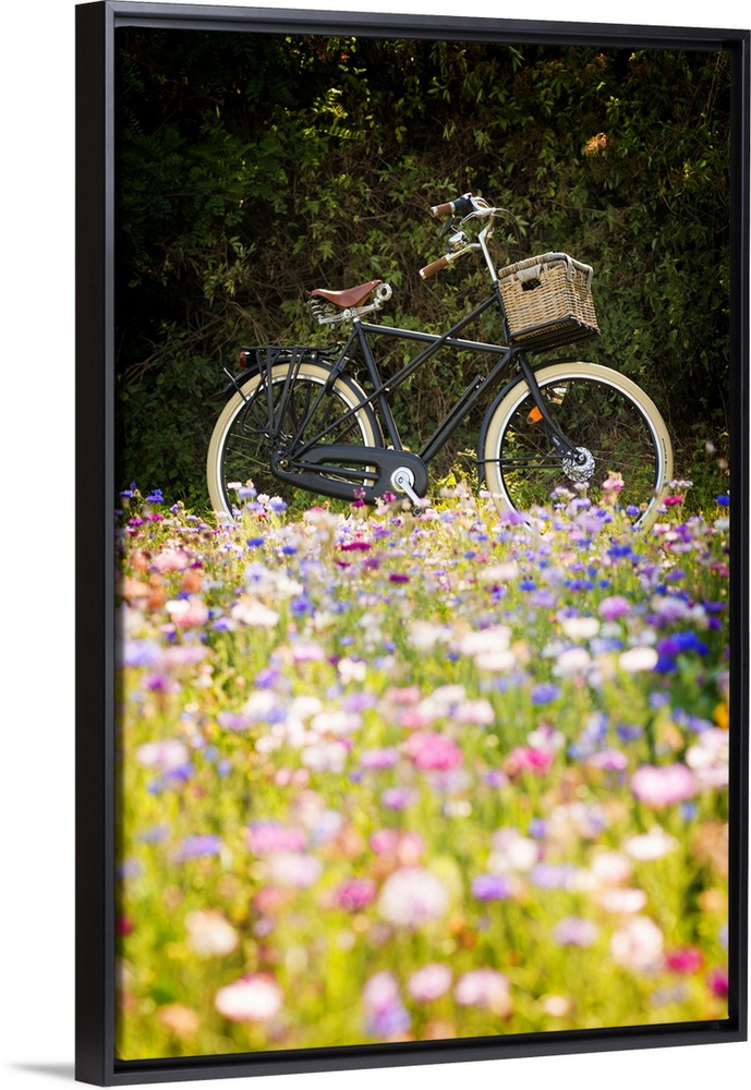 <p>A bicycle behind a colorful flower field</p>