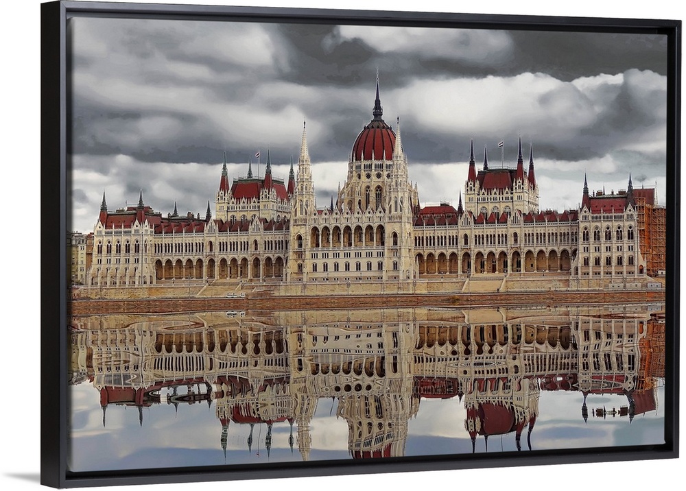 <p>Budapest cityscape reflected in the water of the river below on a cloudy day.</p>