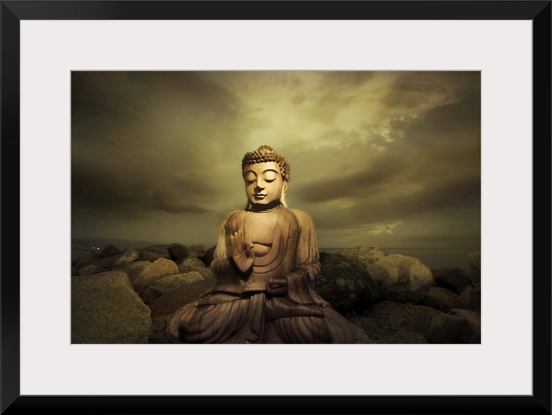 <p>A bhudda on a rocky shore</p>