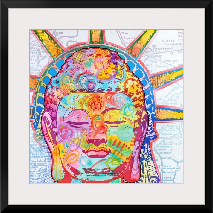 <p>Square illustration of the Statue of Liberty with Buddha's face on a white background with a colorful street map.</p>