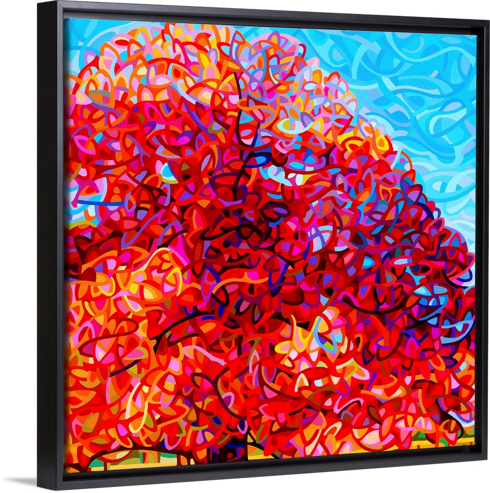 <p>Contemporary artwork of a large stylized tree with bright red leaves.</p>