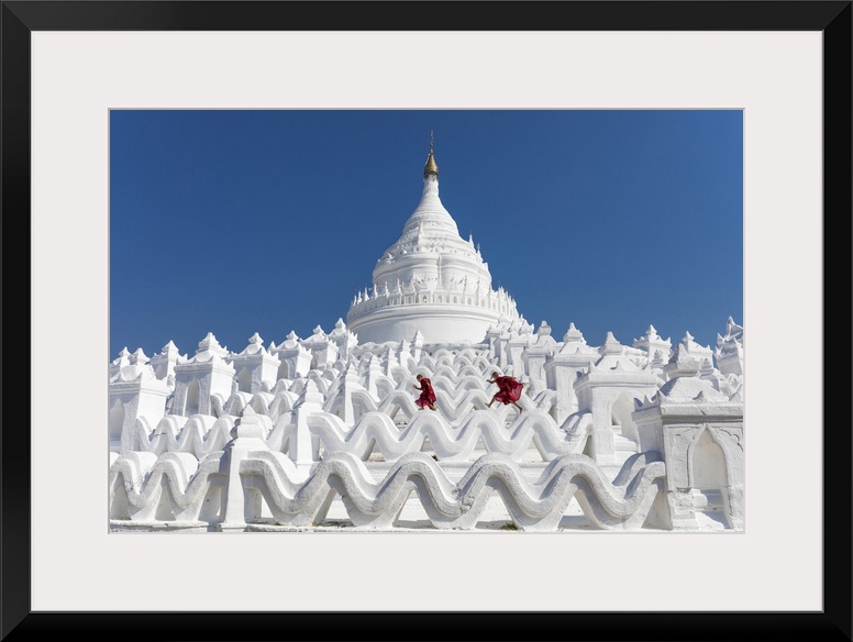 <p>Two young Buddhist monks run and jump across the white walls of Hsinbyume Pagoda, Mingun, Mandalay, Myanmar.</p>