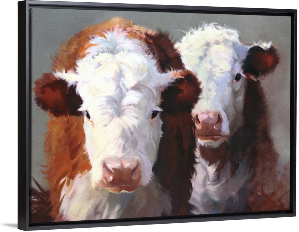 <p>Contemporary painting of two brown and white cows standing closely together.</p>