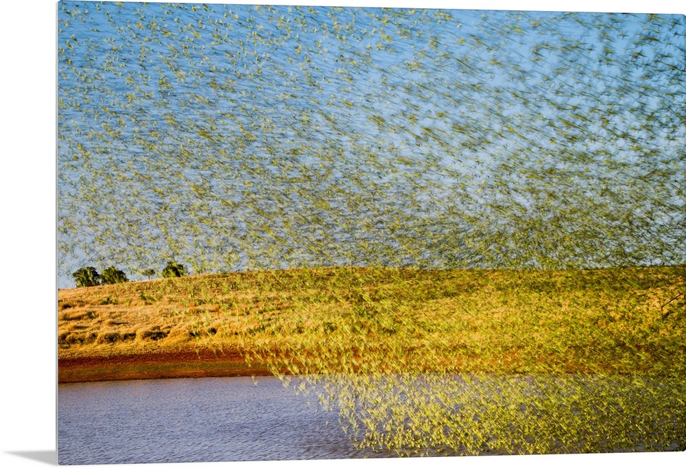 <p>Budgerigars (Melopsittacus undulatus) flocking to find water. These small parakeets are native to Australia, but have been introduced throughout the world as a pet. Photographed in the Northern Territory, Australia, in summer.</p>