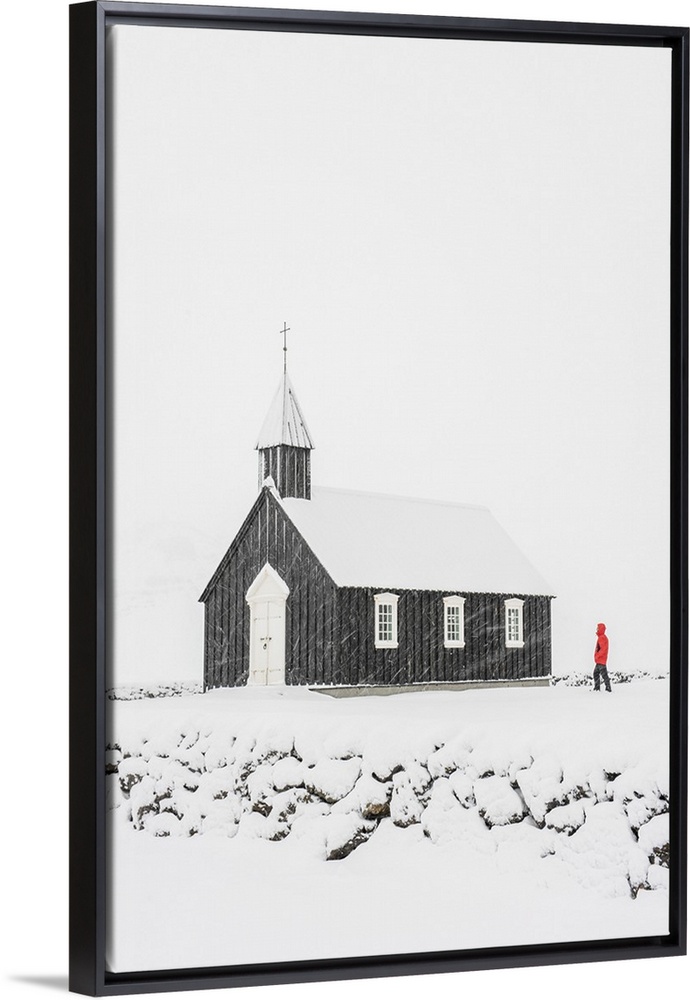 <p>Budir, Snaefellsnes Peninsula, Western Iceland, Iceland. One person with red coat watching the black church under a snow storm.</p>