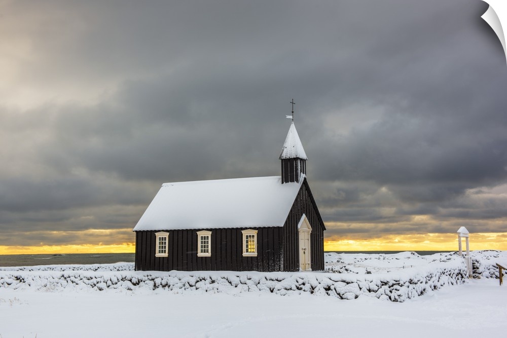 <p>Budir, Snaefellsnes Peninsula, Western Iceland, Iceland. Black church surrounded by the snow in winter.</p>