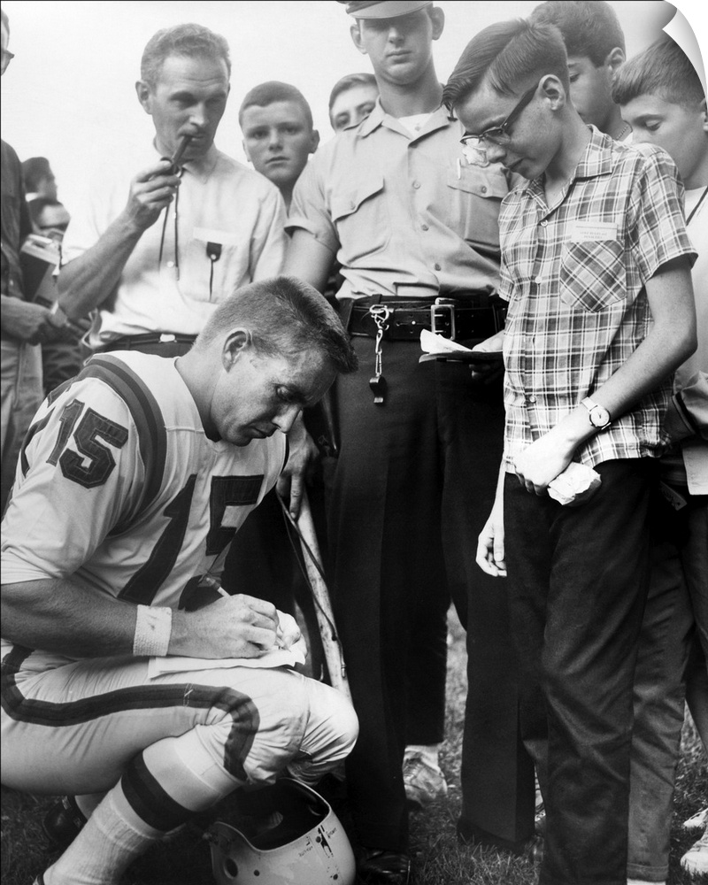 <p>Buffalo Bills player Jack Kemp signs his autograph for a boy on August 4, 1964. Kemp played professional football from 1957 to 1969. In 1970 he successfully ran for Congress and was reelected for 10 terms. In 1989 he was Secretary of Housing and Urban Development in the George H.W. Bush administration from 1989-92.</p>