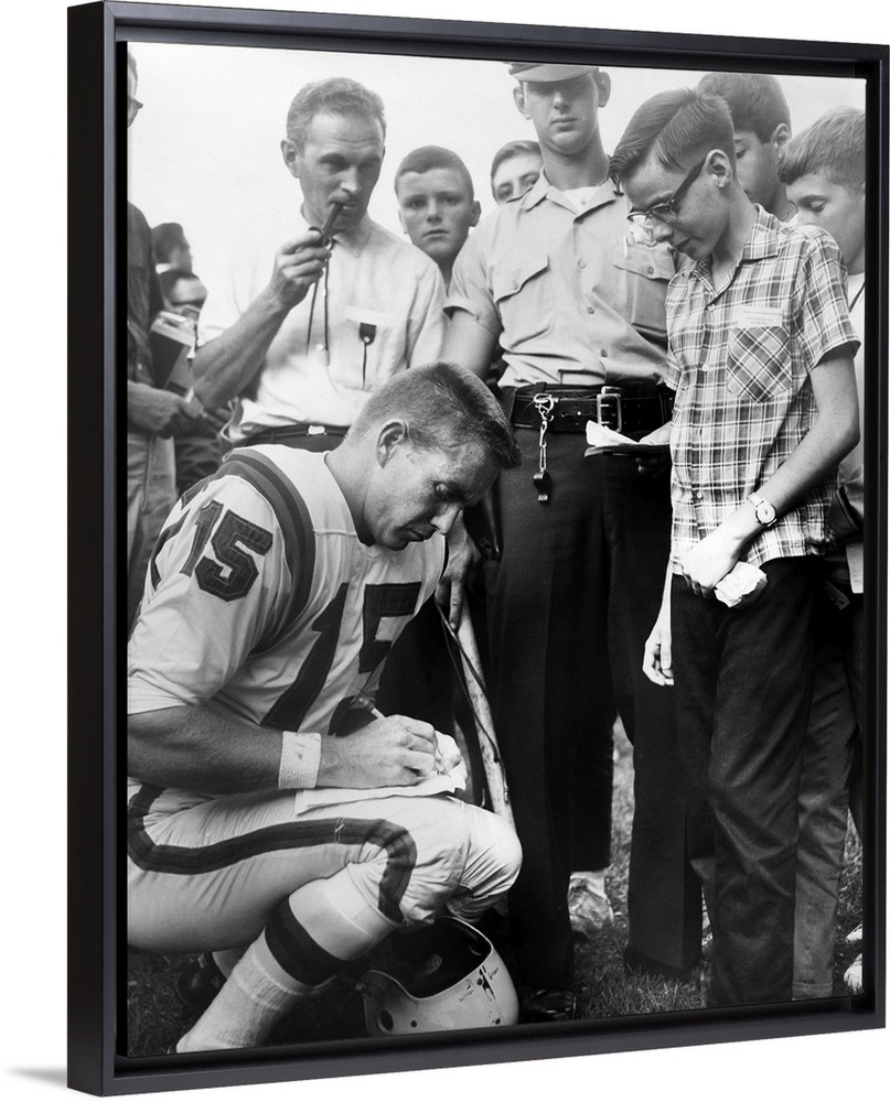 <p>Buffalo Bills player Jack Kemp signs his autograph for a boy on August 4, 1964. Kemp played professional football from 1957 to 1969. In 1970 he successfully ran for Congress and was reelected for 10 terms. In 1989 he was Secretary of Housing and Urban Development in the George H.W. Bush administration from 1989-92.</p>