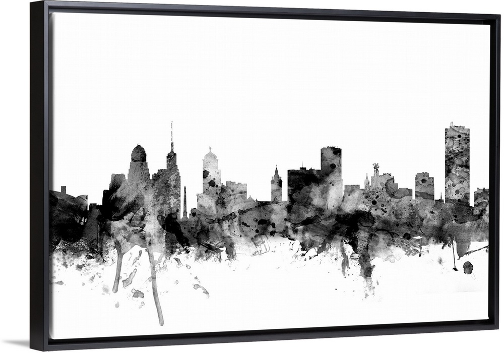 <p>Contemporary artwork of the Buffalo city skyline in black watercolor paint splashes.</p>