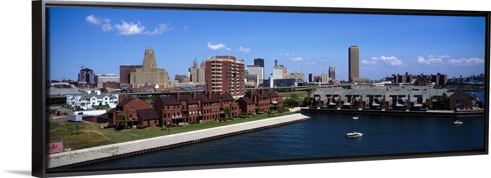 <p>Oversized, horizontal photograph of several small boats in the water in front of the Buffalo skyline in New York, beneath an almost clear blue sky.</p>
