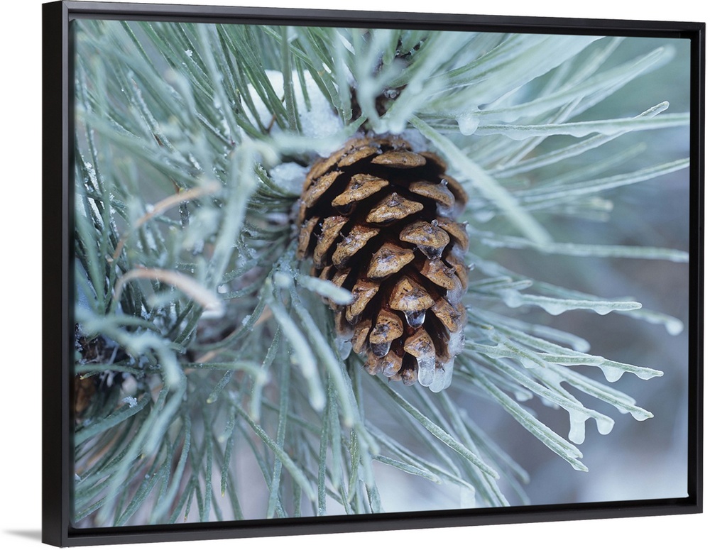 <p>Close-up photograph of a pine cone on a frosty pine needle covered tree branch.</p>
