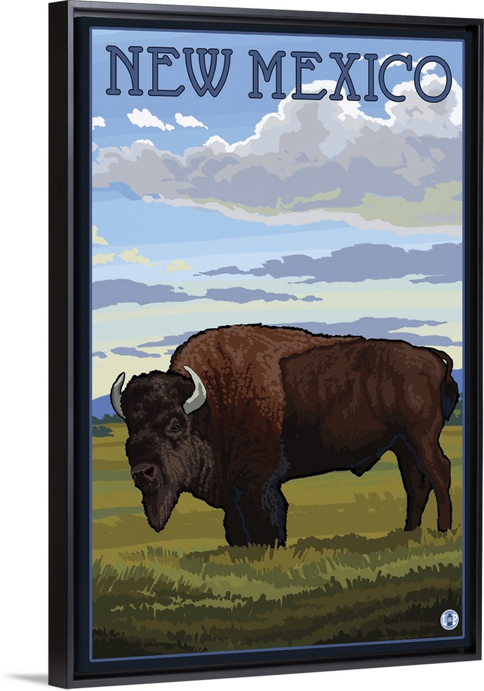 <p>Retro stylized art poster of a bison on the plains, with clouds in the sky overhead.</p>