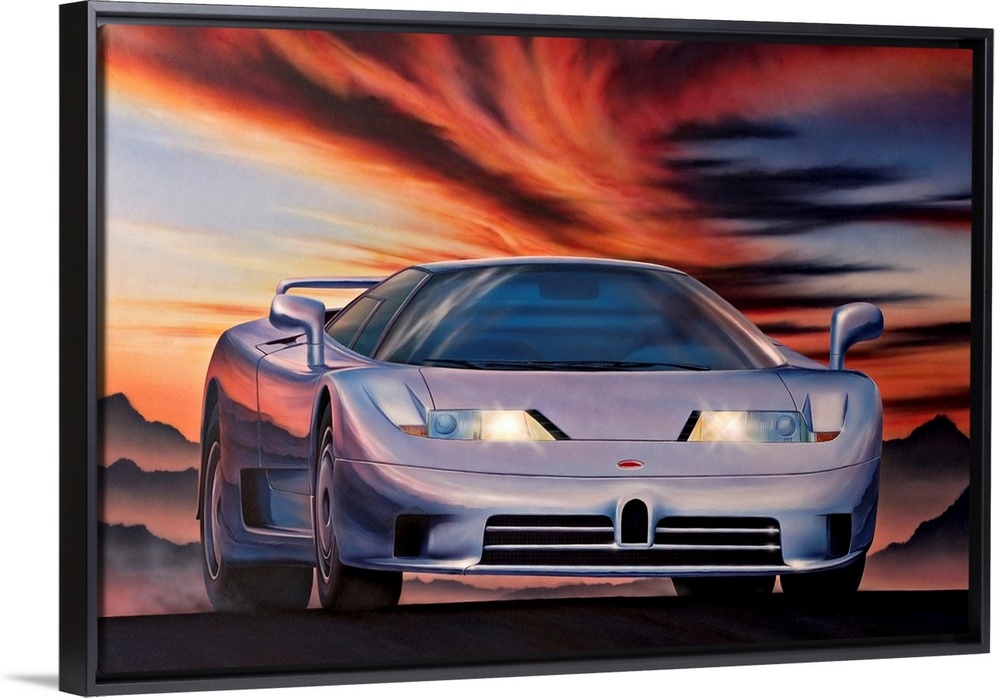 <p>Artwork of sports car with mountains and dark cloudy sky in the background.</p>