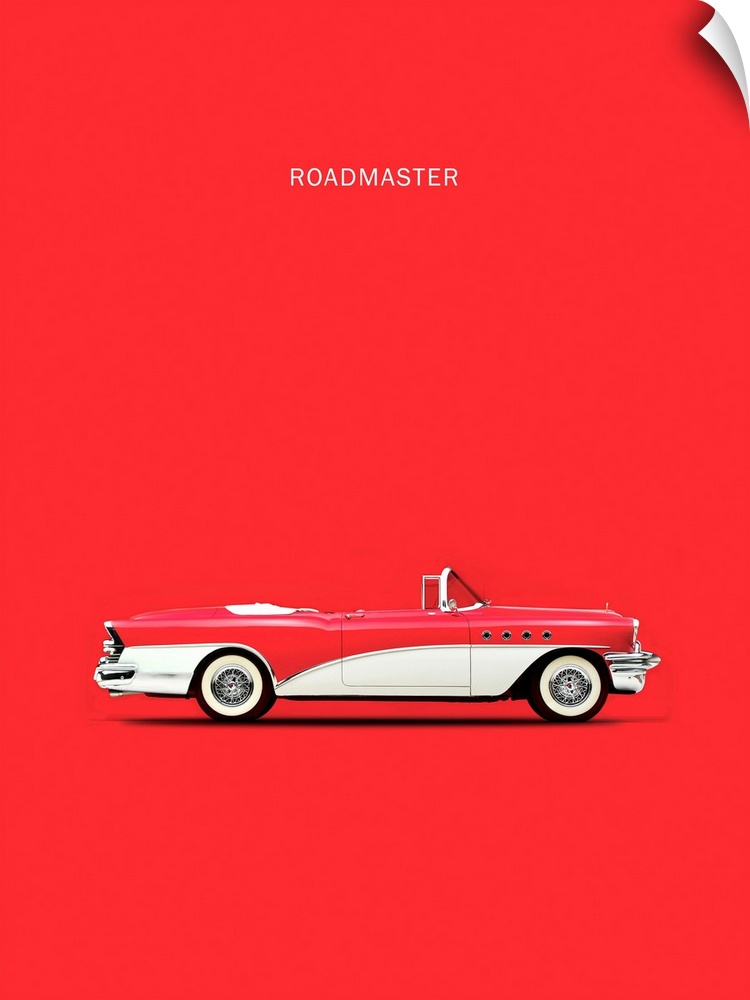 <p>Photograph of a red and white Buick Roadmaster 55 printed on a red background</p>