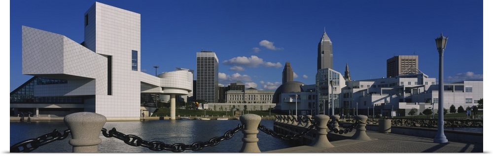 <p>Panoramic picture taken of several buildings lining a body of water in Cleveland Ohio.</p>