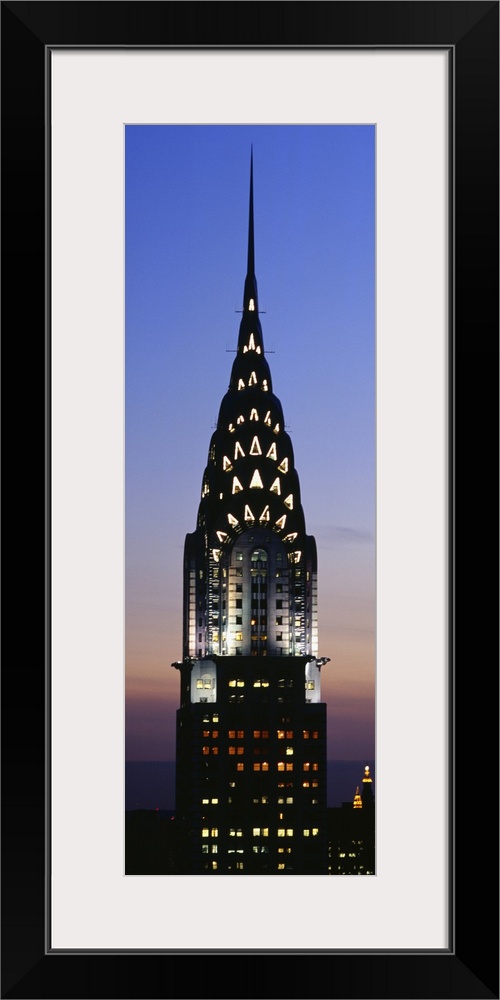 <p>Vertical, oversized photograph of the top of the Chrysler Building in New York City, lit up against the night sky.</p>