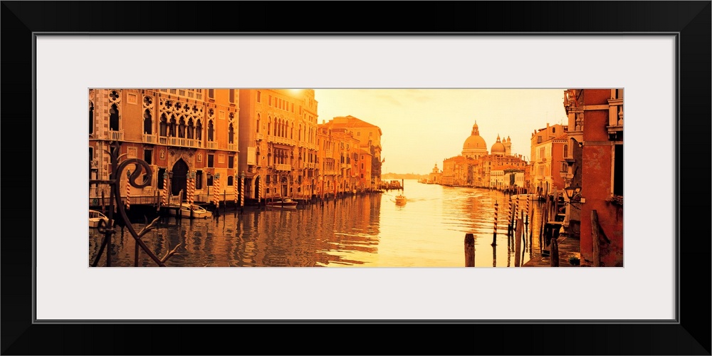 <p>This panoramic photograph captures a still moment in the canals at sunset and this historic city as single gondola approaches.</p>