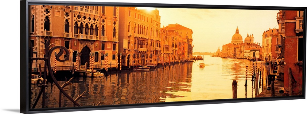 <p>This panoramic photograph captures a still moment in the canals at sunset and this historic city as single gondola approaches.</p>