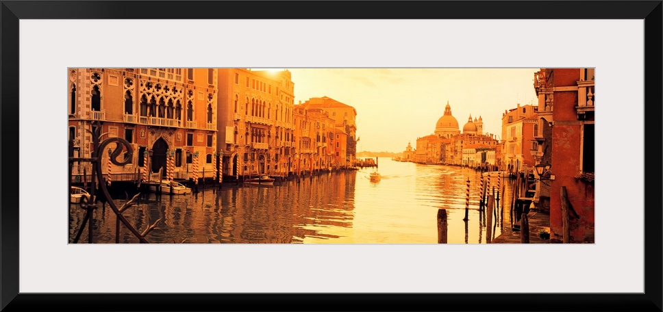 <p>This panoramic photograph captures a still moment in the canals at sunset and this historic city as single gondola approaches.</p>