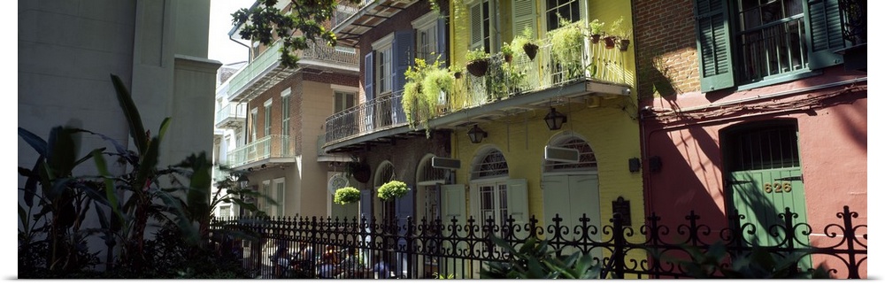 <p>Panoramic picture taken of colorful buildings that line a street in New Orleans.</p>