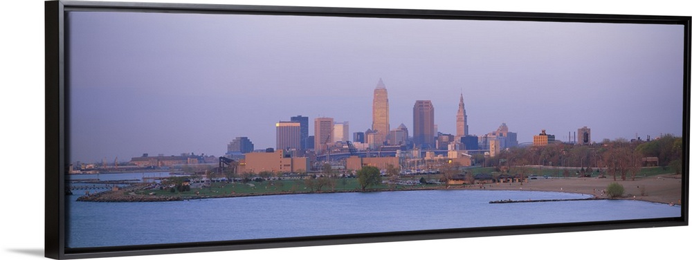 <p>The skyline in Cleveland is shot with a wide angle lens from across a body of water.</p>