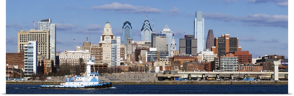<p>Giant panoramic photo of the city of Philadelphia, Pennsylvania (PA). A large barge chugs along the Delaware River as skyscrapers and other large buildings loom in the background.</p>