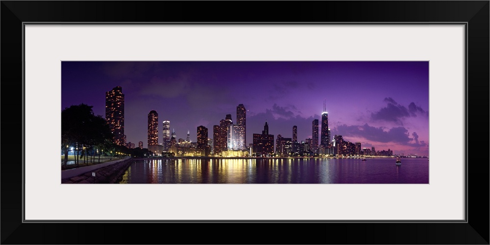 <p>Long canvas photo of a lit up cityscape at sunset by a waterfront.</p>