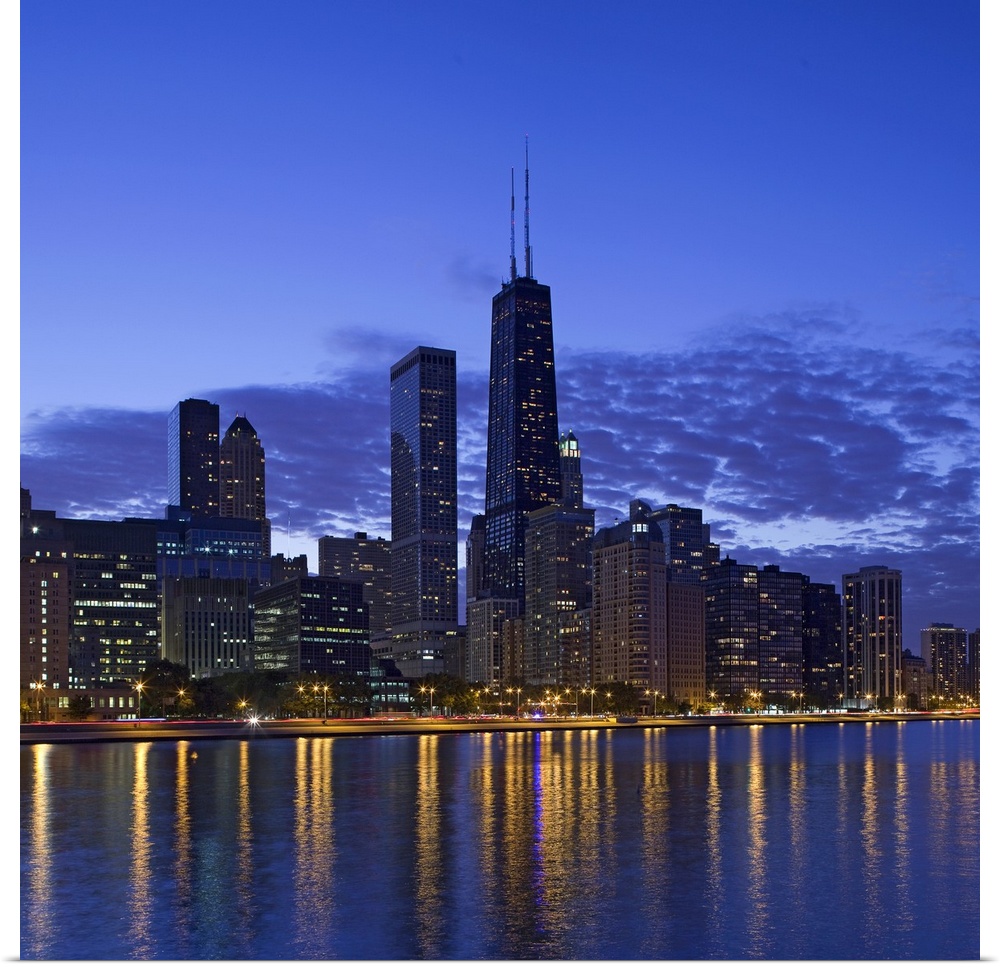 <p>Big, square photograph of the Chicago skyline at night, reflecting in the waters of Lake Michigan.</p>