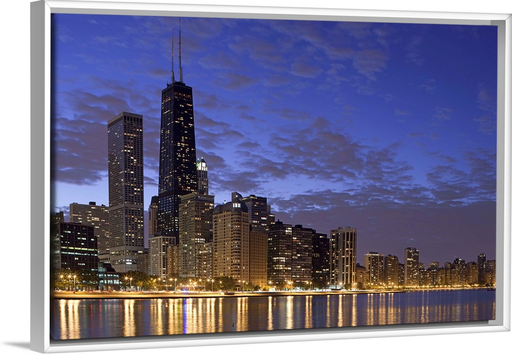 <p>Large photo on canvas of the Chicago cityscape lit up at night reflecting into the nearby waterfront.</p>