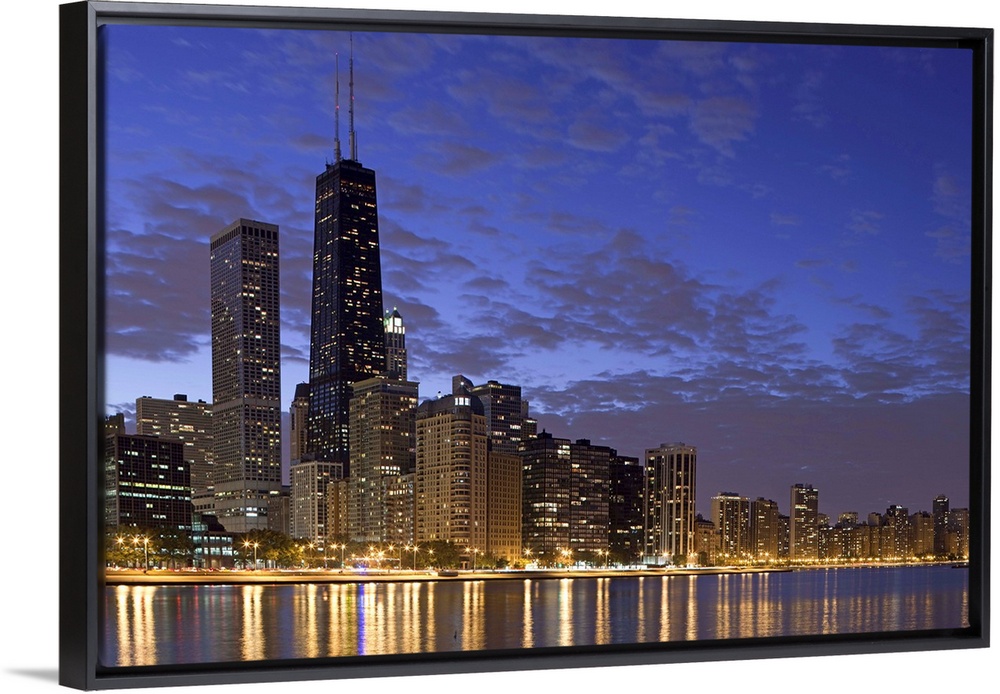<p>Large photo on canvas of the Chicago cityscape lit up at night reflecting into the nearby waterfront.</p>
