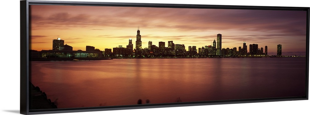 <p>Wide angle, distant photograph of lit skyscrapers of Chicago, over the waters of Lake Michigan, at sunset.</p>