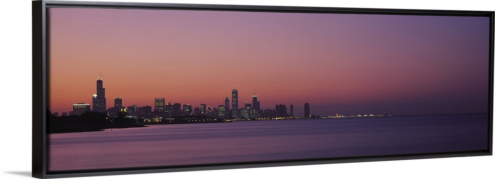 <p>The Chicago skyline is skewed to the left of this panoramic piece and silhouetted by a sunset sky. Lake Michigan largely takes up this photograph.</p>