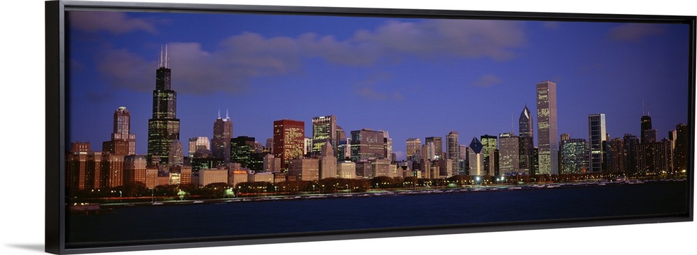 <p>Panoramic photograph displays the busy skyline of a famous city within the Midwestern United States during a sunny day. In the foreground, the dark waters of the lake are sitting ahead of the tall skyscrapers in the background.</p>
