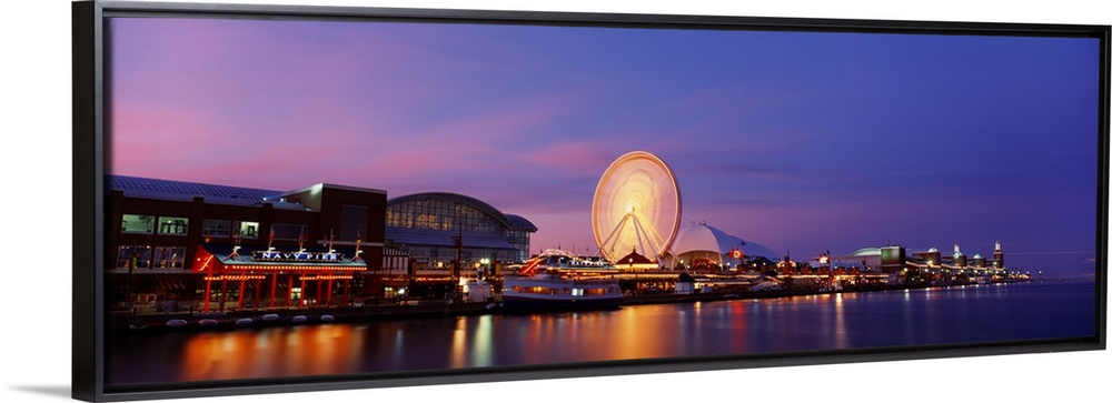 <p>Panoramic photo on canvas of buildings lit up along the waterfront in Chicago with a ferris wheel.</p>