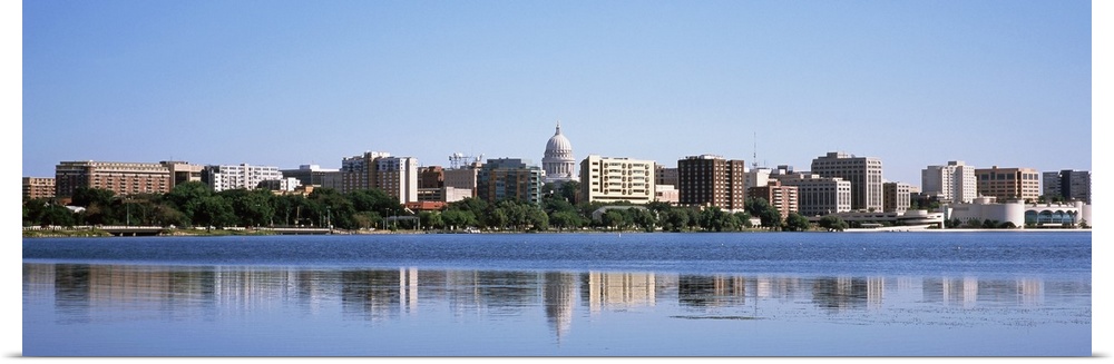 <p>Panoramic picture taken of the city skyline in the capitol of Wisconsin. There is a body of water in front of the skyline that the buildings reflect in.</p>