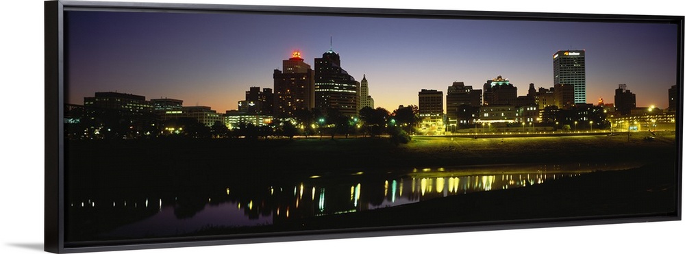 <p>Panoramic skyline of Memphis, Tennessee as the sun begins to rise over the Mississippi river.</p>